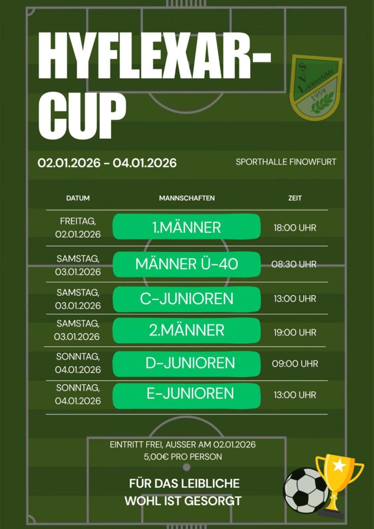 Vom 02.01. – 04.01.2026 lädt der SV Lichterfelde zum diesjährigen HYFLEXAR-Cup in die Sporthalle Finowfurt ein. Drei Tage lang dreht sich alles um spannenden Hallenfußball, engagierte Teams und beste Stimmung zum Start ins neue Jahr.
