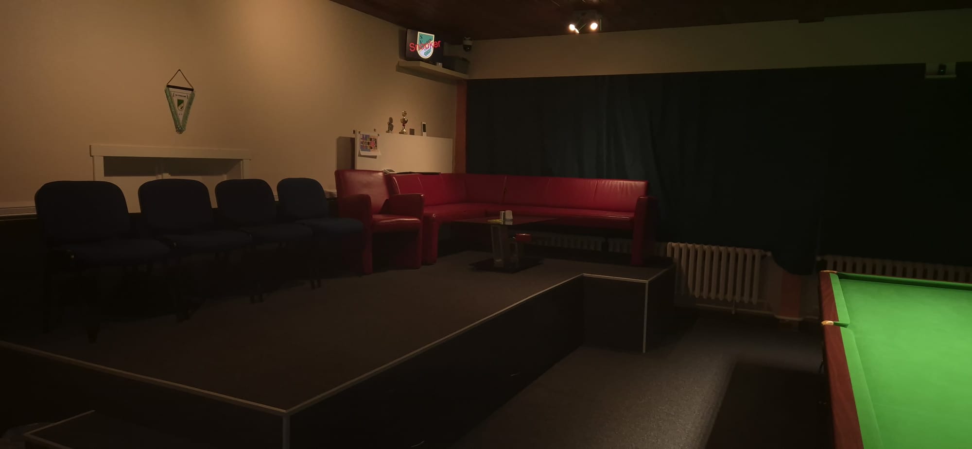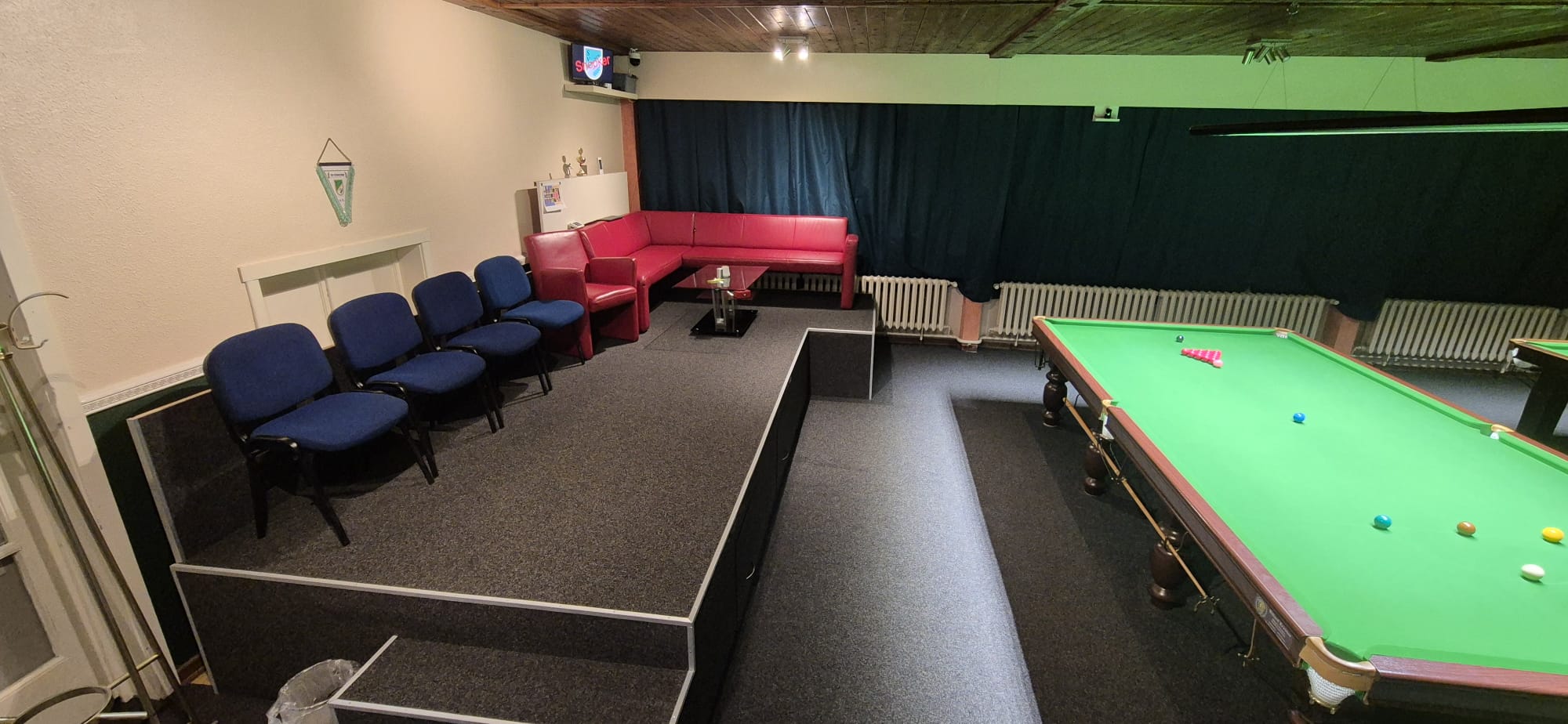 Zusätzlich wurde für unsere Zuschauer ein Podium errichtet. Dort finden nun Stühle sowie eine kleine VIP-Sitzecke Platz. Von rund 60 Zentimetern erhöhter Position aus lässt sich das Geschehen an beiden Snookertischen optimal verfolgen – ein spürbarer Mehrwert für alle Gäste.